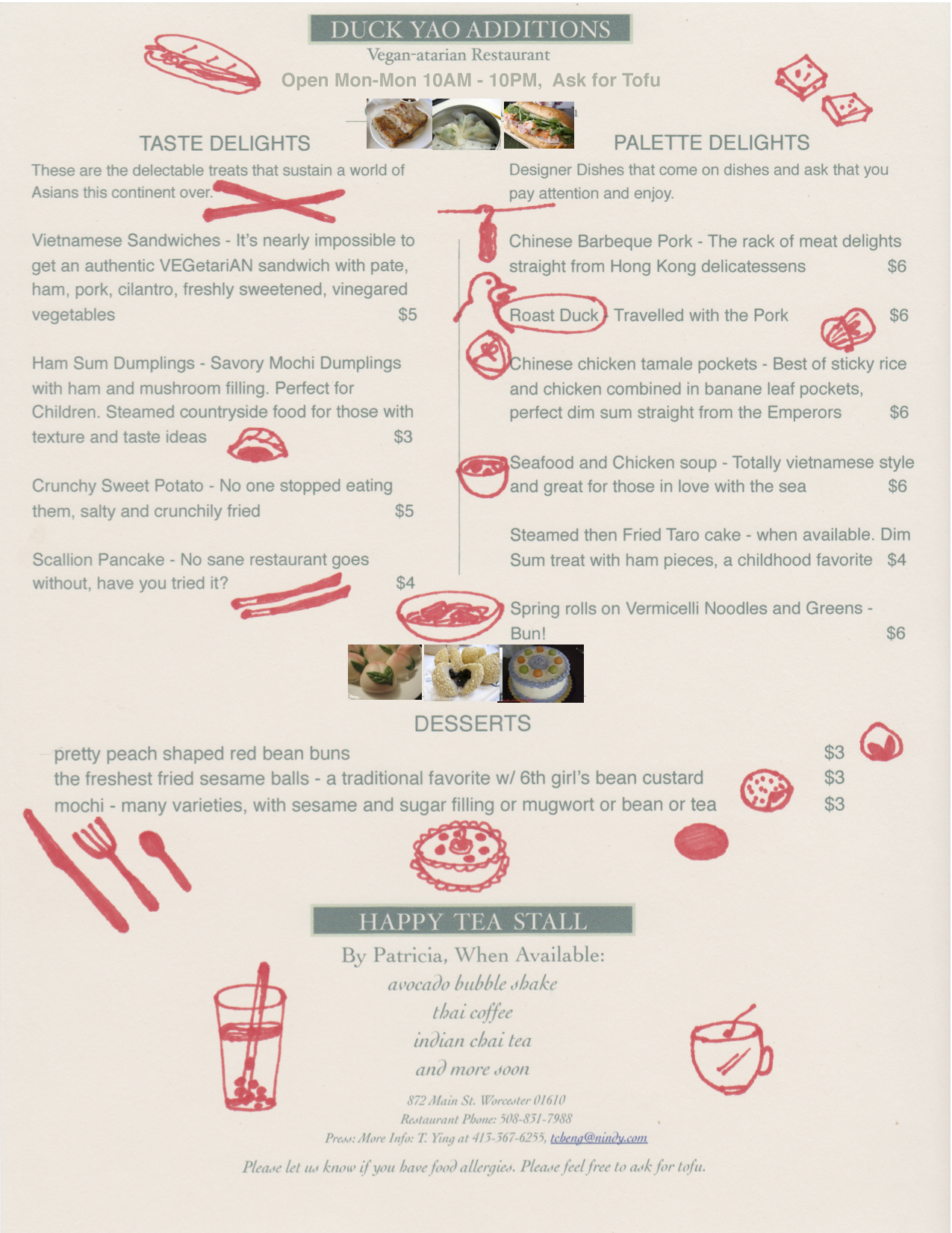 Duck Yao and the Happy Tea Stall began as a invitation-only restaurant at the private home of Chef Mui Loc Chong. Today some say of this jewel that it is the most delicious and creative vegetarian restaurant in New England. Take a trip to Duck Yao -- we have won over many -- you may find yourself delighted. Our mission is to bring on delight, and sublime experiences, sometimes imaginary. Our food comes from our own organic gardens and orchard.